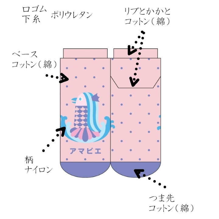 キャラクターなど柄が入った靴下の材質表示のパターンについて紹介して参ります。
