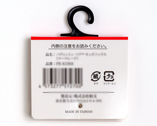 紙タグはバノックガンを使って靴下に穴をあけてプラスチックのピンを通す必要があります。ピンの取り外し方によっては、靴下に穴をあけてしまう可能性があるため、個人的な意見にはなりますが、紙帯の仕様をおすすめしております。