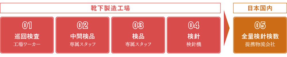 海外工場で製造された全ての靴下を日本国内の業務提携先の物流センターにて金属探知機で検査します。