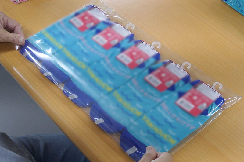 ヘッダーやフックなどの梱包資材を取り付けて、PP袋に入れて梱包します。自動化された機械で行うこともあります。