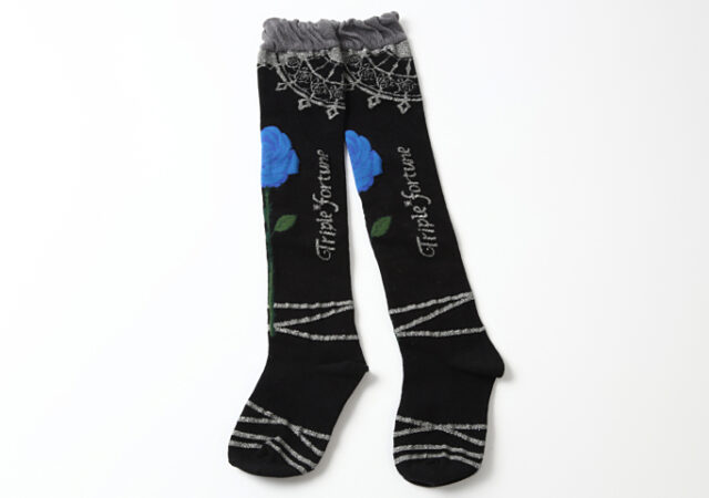 太ももまで長さがある靴下。柄を入れつつ伸縮性とフィット感に優れた靴下に仕上げます。
