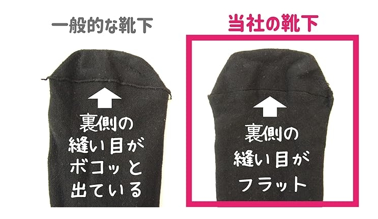 靴下つま先の縫い目がフラットなシームレスの仕様で製造。つま先に縫い目が当たらないので気持ちよく着用頂けます。(自動リンキング、ハンドリンキング両方対応しております。)